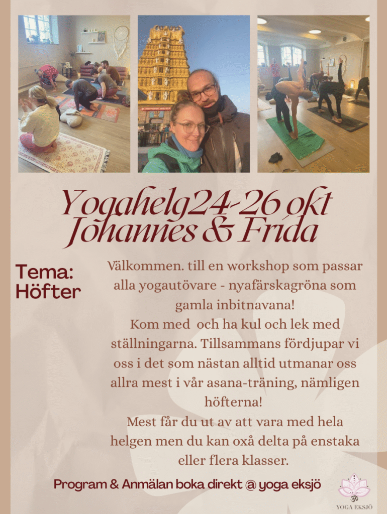 Sista helgen i oktober kommer Johannes & Frida från Mysore Malmö tillbaka till oss och undervisar. Det här är en helg för alla som är nyfikna på yoga, oavsett om du är nyafärskagrön eller inbitnavan!