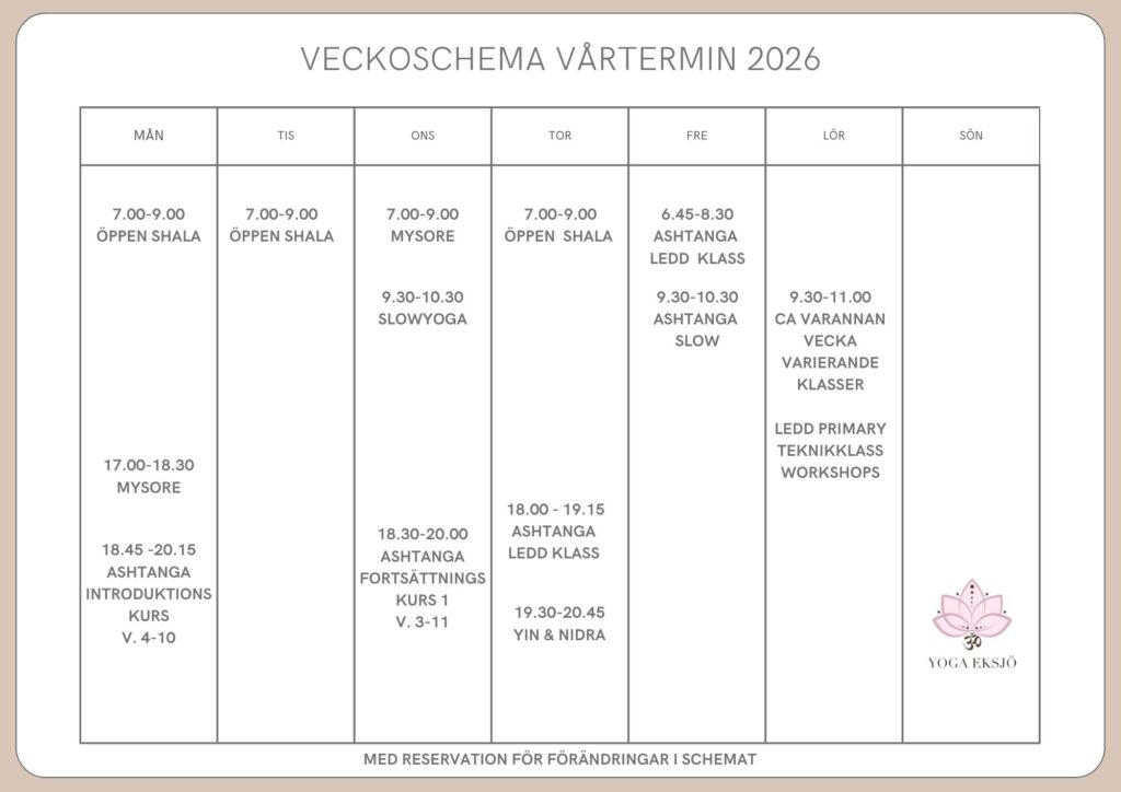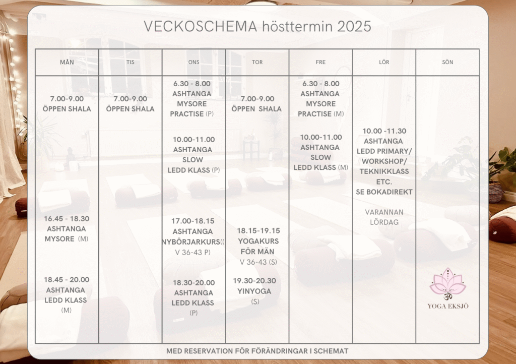 Vi har klasser på morgon, dagtid och kväll så att du ska kunna komma och yoga när det passar dig.